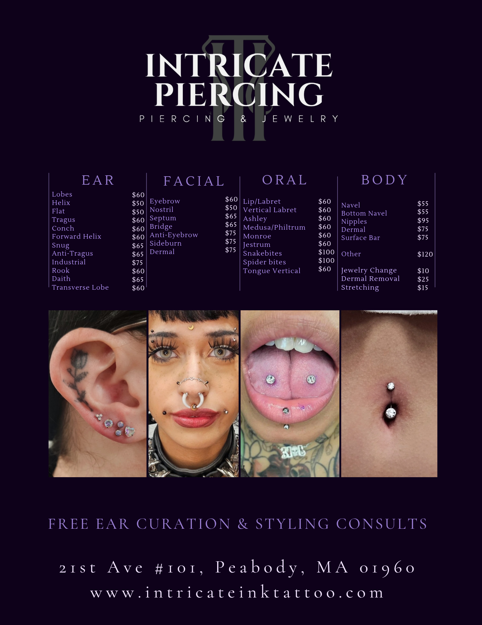 Every person’s body is unique, and we understand the importance of proper placement and individual style. Our piercers will consult with you to achieve the perfect look that complements your style and anatomy.